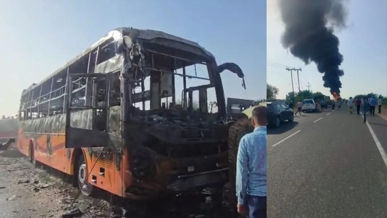 Jaisalmer. A massive fire broke out in a bus full of passengers in Jaisalmer, Rajasthan. There were 57 people traveling in the bus during the accident. Information is coming out that 15 people have died in this accident, while 25 passengers have sustained burn injuries. It is being told that this private bus was going from Jaisalmer to Jodhpur on Tuesday, during which suddenly the bus caught fire. This accident happened near Thaiyat village. There is chaos on the spot due to fire in the bus. At present relief and rescue work is being done.